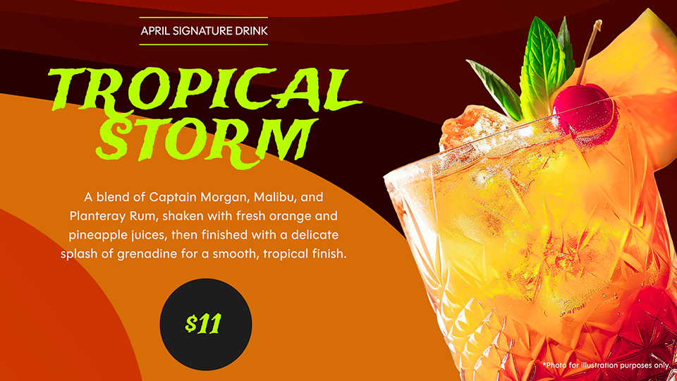 This month's drink special features a blend of Captain Morgan, Malibu, and Planteray Rum, shaken with fresh orange and pineapple juices, then finished with a delicate splash of grenadine for a smooth, tropical finish.