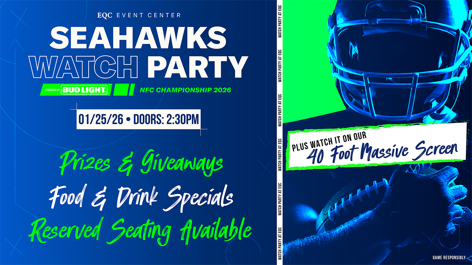 Get ready for the NFC Championship game as Seattle takes on L.A. at EQCβs Seahawks Watch Party Presented by Bud Light on Sunday, January 25, at the EQC Event Center. Join the 12s and watch the Seahawks dominate on our massive 40 foot screen for the ultimate game day experience.