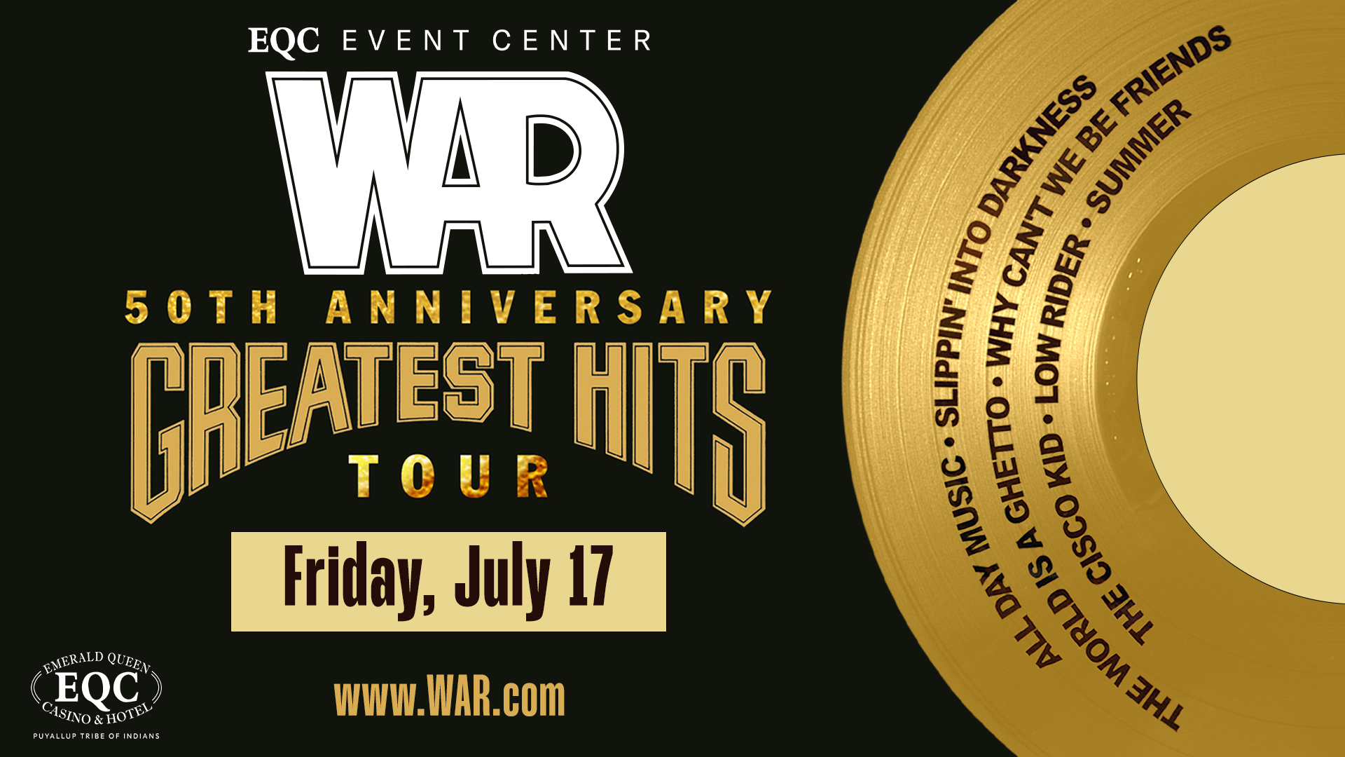Known for their genre-blending sound and classic hits, iconic band WAR takes the stage at the EQC Event Center on Friday, July 17 for their 50th Anniversary Greatest Hits Tour!