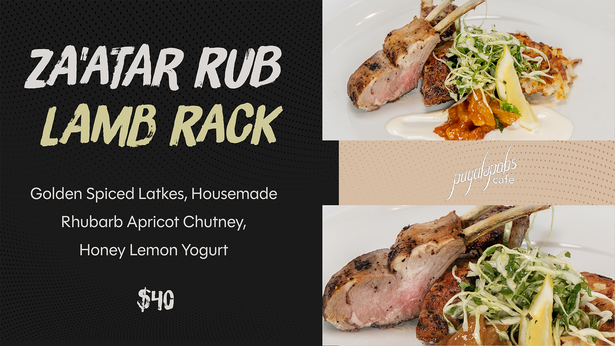 Golden spiced latkes, housemade rhubarb apricot chutney, honey lemon yogurt