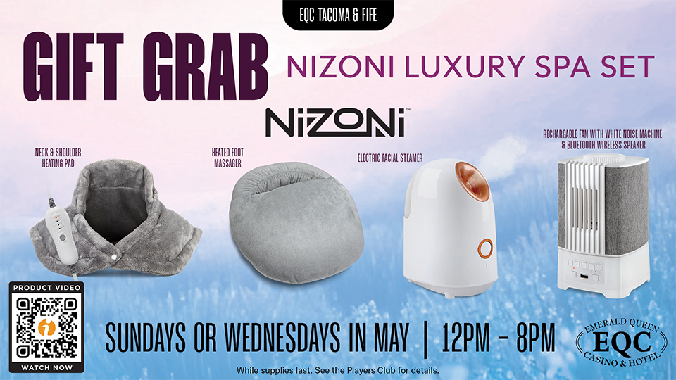 Visit any promo kiosk at EQC Fife or Tacoma on Sundays through Fridays to pick your lottery numbers and print your ticket daily from April 26 through July 25. On drawing days, visit any promo kiosk at EQC Fife only. Lottery picks must be made at least 20 minutes before each drawing time on drawing days. Participants may earn additional tickets for every 500 base points earned on slots or table games. Maximum of five additional tickets per day.