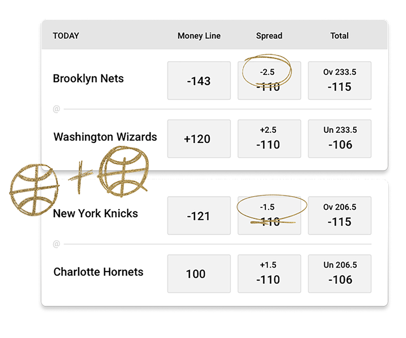 You can combine or "parlay" the Nets -2.5 and the Knicks -1.5 into one single bet. If the first bet wins, your bet is rolled into the next game. If the next bet wins as well, the payout will be higher than if you had bet each game separately. But if either bet loses, the entire bet is lost.
