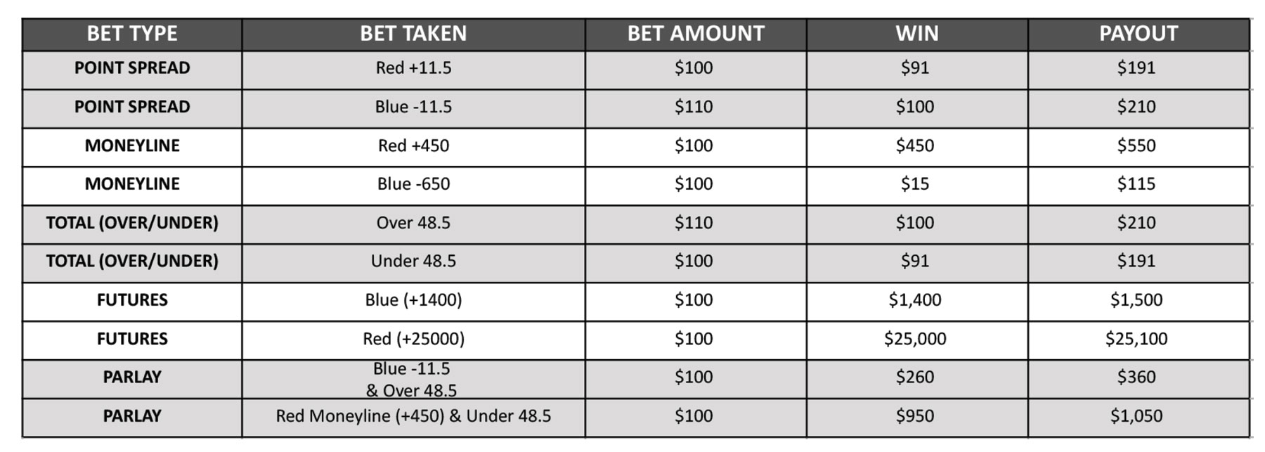There are no point spreads to consider but that doesn’t mean there isn’t a favorite and underdog. When betting the moneyline, your potential bet payout will change depending on which team is favored. The payout is presented in relation to a $100 wager. The original stake is returned along with the winnings for any bet placed that is a winner. A (+) represents how much more than $100 the bet pays. Reversely a (-) represents how much you must bet to win $100.